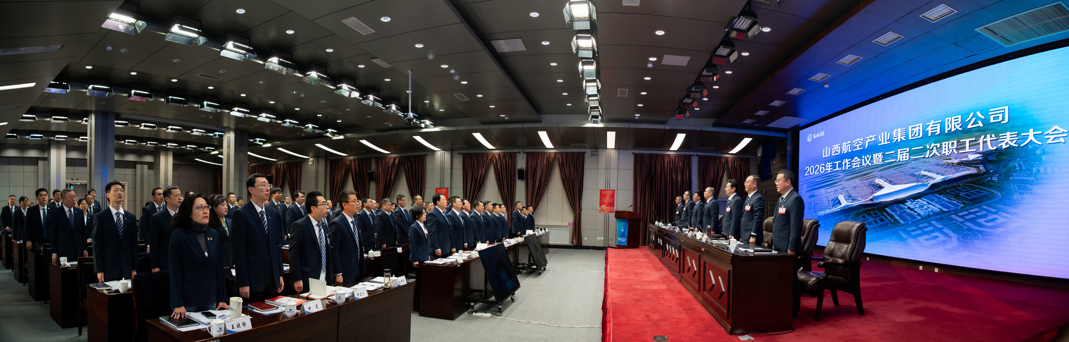 2月6日,在雄壮的国歌声中,山西航产集团召开2026年工作会议暨二届二次职工代表大会。全面总结回顾集团2025年工作取得的成绩,明确了2026年工作总体思路和工作目标。集团党委书记、董事长陈阳出席会议并讲话,党委副书记、副董事长、总经理贾勇作题为《攻坚克难 乘势而上 奋力开创高质量发展新局面》的工作报告,党委专职副书记、副董事长、工会主席高之岩主持会议,集团公司总会计师钟晓强作2025年度财务工作报告。外部董事朱景学,党委委员、副总经理丁国栋、员佩刚,副总经理刘成、韩瑞林出席会议。