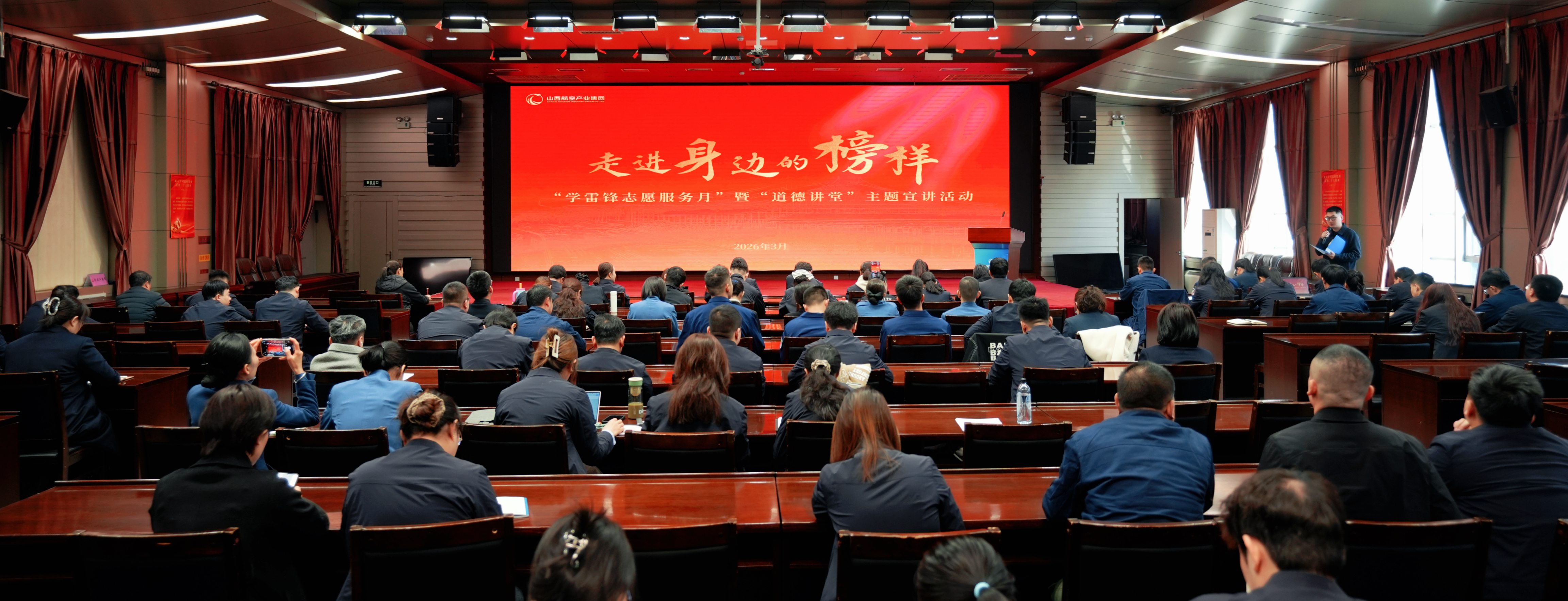 3月20日,山西航产集团以“走进身边的榜样”为主题,开展“学雷锋志愿服务月”暨“道德讲堂”主题宣讲活动。本次活动邀请机务工程技术分公司维修员吴宏伟、集团驻村工作队包村队长兼前龙村第一书记秦红霞以及太原机场公司应急管理中心消防支队战斗员王斌斌现场分享,讲述他们立足岗位、践行雷锋精神的故事,让职工在沉浸式学习中接受道德洗礼、汲取奋进力量。来自太原地区各二级党组织的130余名职工代表聆听了此次宣讲。